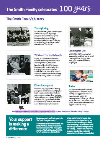 Visit www.thesmithfamily.com.au/about-us/our-story/timeline for more detail about The Smith Family’s history.