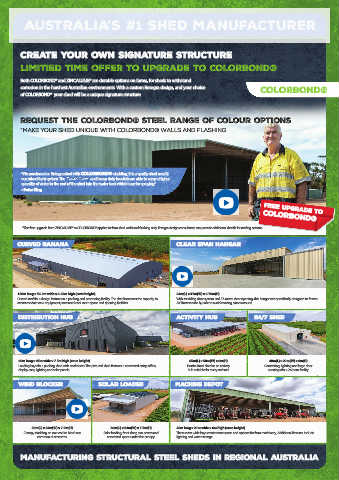 *The free upgrade from ZINCALUME® to COLORBOND® applies to farm shed walls and ashing only. Entegra design consultants can provide additional details for roo ng options.